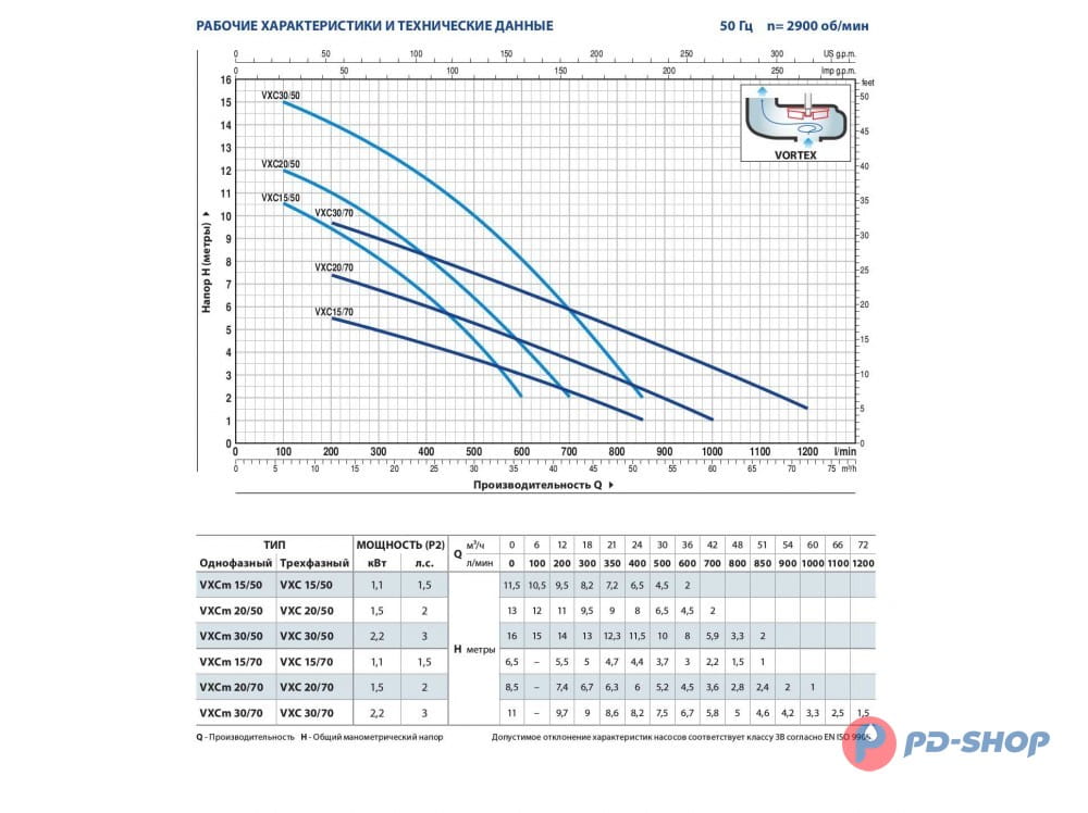 Погружные фекальные насосы VORTEX серии VXC, разработаны для откачки загрязненных и сточных вод, как в бытовой, так и в промышленной области. Электронасосы VXC оснащены открытым рабочим колесом, работающим по принципу жидкостного вихря. Рабочее колесо размещается в просторной кольцевой камере, защищенной корпусом насоса и нижним основанием, которое, препятствует прохождению твердых частиц диаметром, превышающим. Рабочее колесо вращает жидкость, находящуюся в корпусе насоса, создавая вихрь, который передает кинетическую энергию жидкости, выталкивая ее из нагнетательного патрубка, и всасывая новую жидкость из кругового прохода, предусмотренного в нижнем основании. Таким образом, удается передать энергию жидкости без необходимости ее проведения по узким каналам, задаваемым лопаткой рабочего колеса, а также обеспечить прохождение твердых частиц во взвешенном состоянии с присутствием удлиненных волокнистых тел, без опасности закупорки.